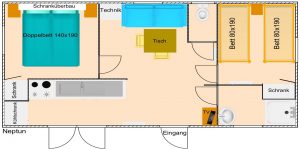 Behagliches Mobilhome auf ca. 26 qm plus 18 qm Veranda. Komplett eingerichtet mit Wohnraum plus offener Küche und Esstisch, Bad mit Dusche und separatem WC. Es verfügt über zwei Schlafräume, jeweils mit Doppelbett. Wenn Du unser Mobile-Home betrittst wird Dir der geräumige Wohnbereich, die moderne Küche und das schöne Badezimmer auffallen. Große Glasfronten sorgen für viel Licht.