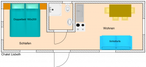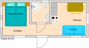For 2 adults and 1 small child. Single kitchen with 2 hotplates and fridge. Additionally, the chalet also features a toilet including a washbasin. The chalet is equipped with a double bed and an additional sofa bed. On the 10m² terrace, you can enjoy the sunset.