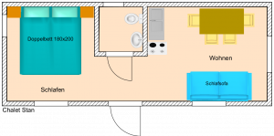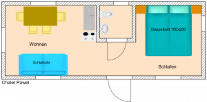 Our chalets Stan and Pawel offer a relaxing holiday in a quiet atmosphere across approximately 20 sqm plus an outdoor area. They are fully furnished and, with their open living/dining area and open kitchen, provide a perfect place for you. Additionally, these chalets feature a chemical toilet including a washbasin. The chalets are equipped with a double bed and an additional sofa bed.