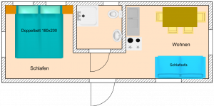 Our chalets Mathilde, Gerda, and Bärbel offer a relaxing holiday in a quiet atmosphere across approximately 20 sqm plus an outdoor area. They are fully furnished and, with their open living/dining area and open kitchen, provide a perfect place for you. Additionally, the chalets also feature a spacious bathroom including a shower and chemical toilet. The chalets are equipped with a double bed and an additional sofa bed.
