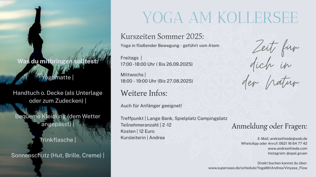 activities Reservierung bitte online hier:https://www.supersaas.de/schedule/YogaMitAndrea/Vinyasa_Flow Alle Infos rund um Deinen Aufenthalt immer griffbereit in Deiner Hosen- oder Handtasche Aktuelle News vom Kollersee mit unserem Newsletter newsletter Anmeldung